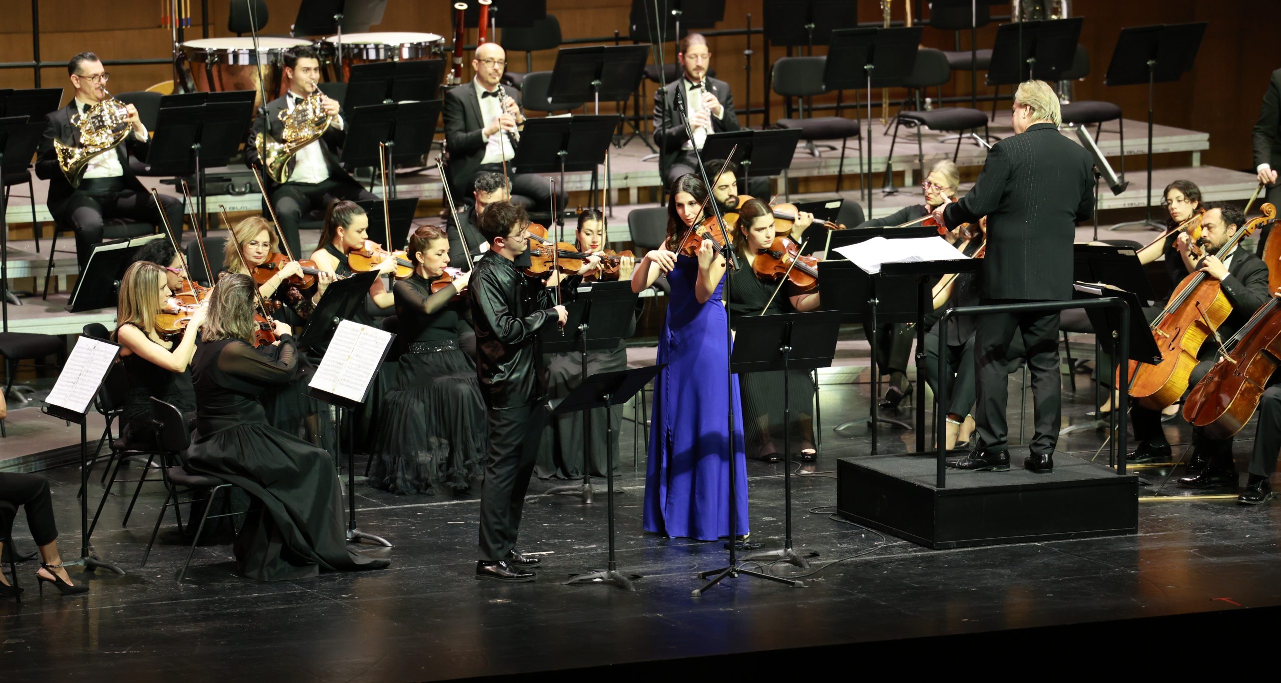 Konserin ilk bölümünde, Mozart’ın 1779 yılında çıktığı Avrupa turnesinin ardından tamamladığı Keman ve Viyola için Senfonik Konçertant seslendirildi. Mozart’ın olgunluk döneminin en parlak örnekleri arasında yer alan yapıt, viyolada Denizsu Polat, kemanda Deniz Yakın’ın yorumlarıyla hayat buldu.