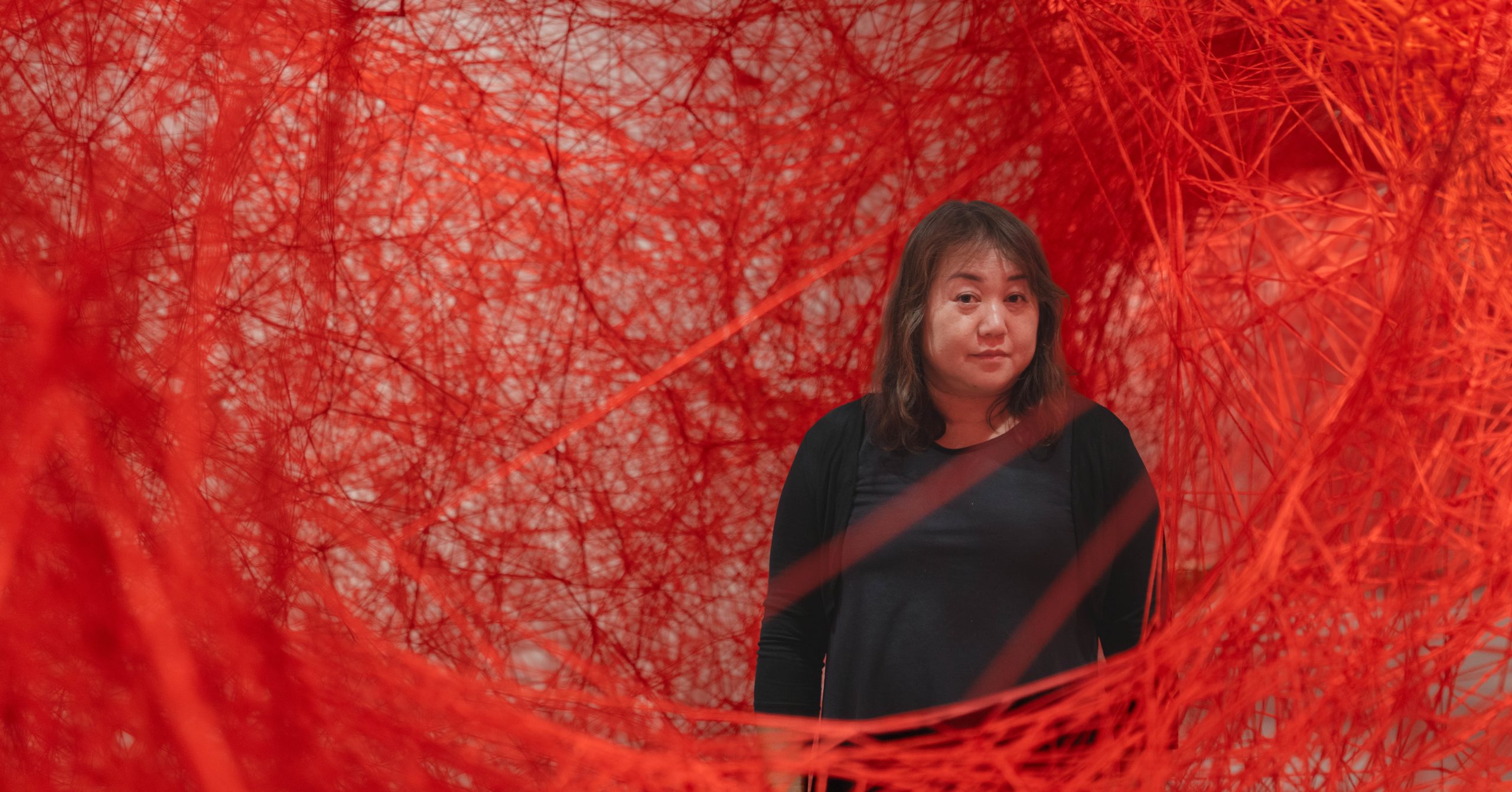 Shiota, “Dünyalar Arasında” başlıklı büyük ölçekli yerleştirmesini, Asya ve Avrupa’nın kesişim noktasında yer alan İstanbul’un coğrafi ve kültürel konumundan yola çıkarak üretti. Sergi salonunu ağ benzeri kırmızı ipliklerle saran bu yerleştirme, küratöryel kurgunun da yönlendirmesiyle izleyicilerin kendi yaşamlarını, anılarını ve ilişkilerini daha evrensel bir insanlık tanımı üzerine düşünmeye davet ediyor.